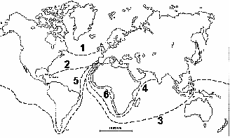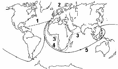 In 1488 zeilt de Portugees Barthelomeas Dias langs de Westkust van Afrika en bereikt Kaap de Goede Hoop. Deze tocht wordt weergegeven door het cijfer: